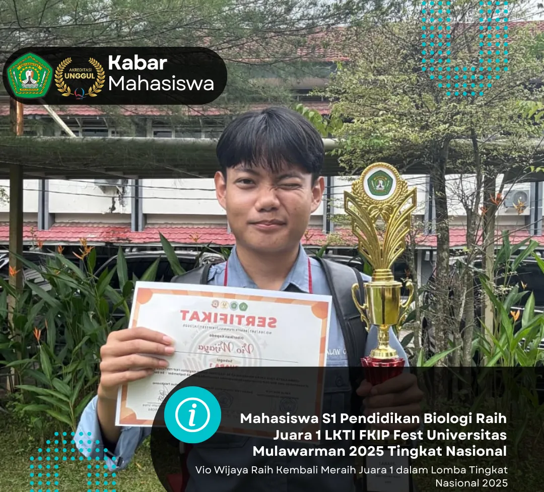 Kabar gembira dan membanggakan datang dari Program Studi S1 Pendidikan Biologi [Nama Universitas Anda, misal: Universitas Mulawarman]. Salah satu mahasiswa terbaik kami berhasil menorehkan prestasi gemilang dengan meraih Juara 1 dalam Lomba Karya Tulis Ilmiah (LKTI) Tingkat Nasional.