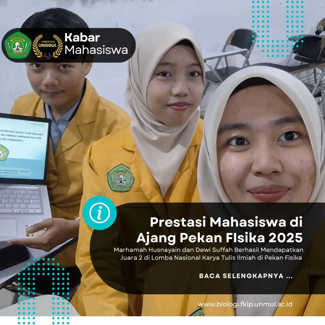 Samarinda, 22 Mei 2025 – Dua mahasiswi Program Studi Pendidikan Biologi FKIP Universitas Mulawarman, Dewi Suffah dan Marhamah Husnayain, berhasil meraih Juara II pada Lomba Karya Tulis Ilmiah Nasional yang digelar dalam rangka Pekan Fisika Universitas Mulawarman 2025. Kegiatan tersebut berlangsung pada tanggal 14-18 Mei 2025 dan diikuti oleh tim delegasi dari berbagai perguruan tinggi di Indonesia.