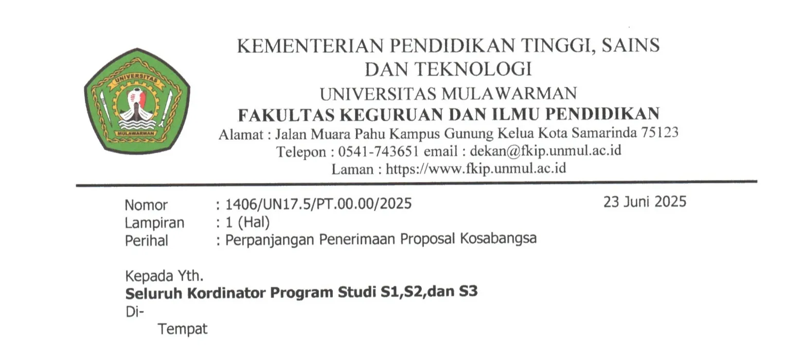 Menindak lanjuti surat dari Lembaga Penelitian dan Pengabdian Kepada masyarakat Universitas Mulawarman No.709/UN17.L1/TU/2025 Tanggal 19 Juni 2025, Perihal Perpanjangan Penerimaan Proposal Program Kosabangsa Tahun Anggaran 2025, maka kepada seluruh Kordinator Program Studi Fakultas di Lingkungan Universitas Mulawarman perihal tersebut di atas untuk bisa diteruskan ke semua Dosen Program Studi. Adapun hal hal yang disampaikan sebagai berikut:
